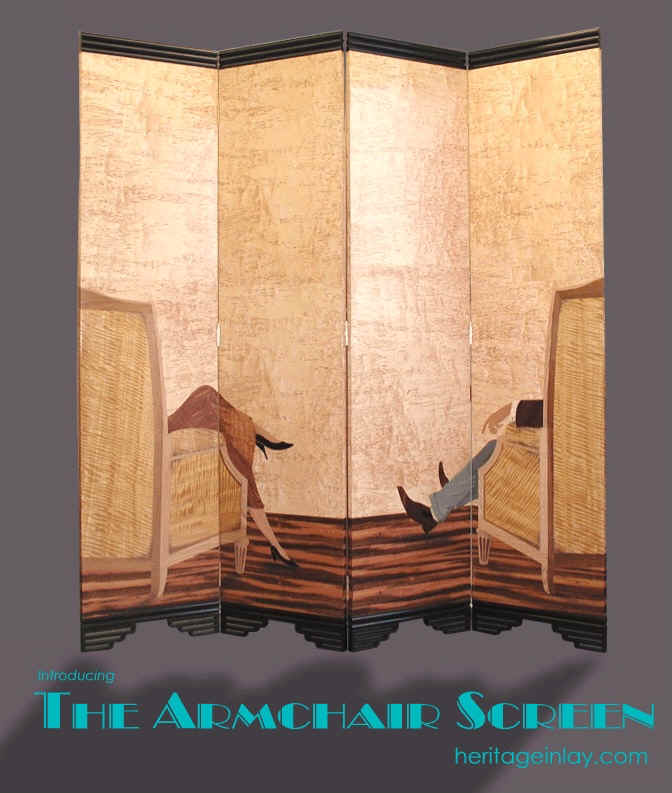 A four panel screen,The Armchair Screen features a large marquetry mural,